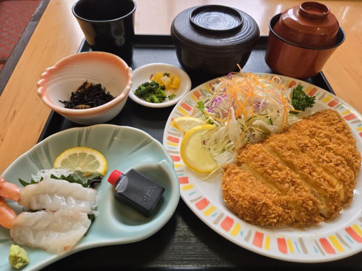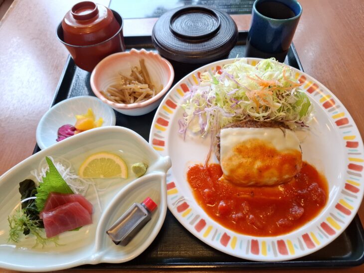おはようございます 今日のメイン:チーズハンバーグトマトソース 刺身:マグロ刺 他5品です ご飯のおかわり無料です ご来店お待ちしております -