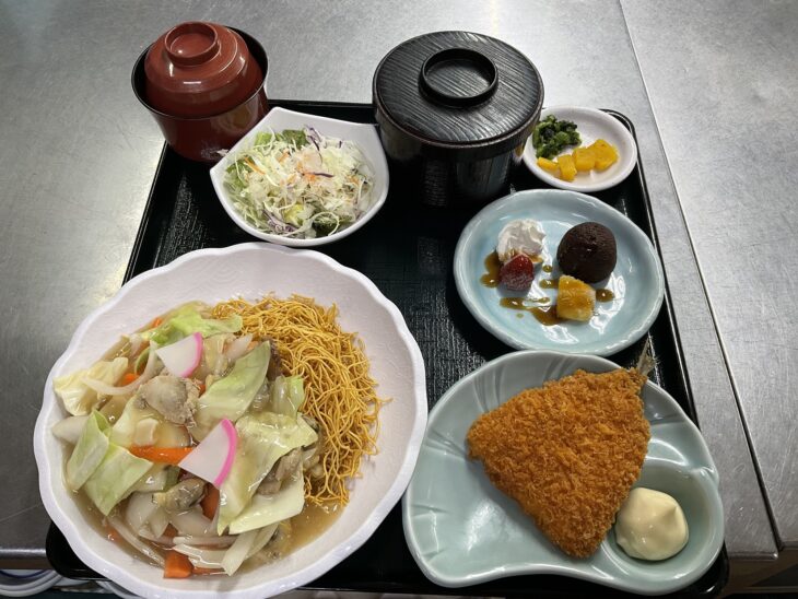 おはようございます。 本日の日替わり定食です。 ・皿うどん ・アジフライ ・バレンタインデザート 皆様のお越しをお待ちしております。 -