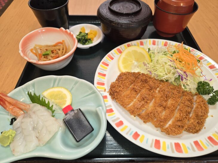 メイン:チーズハンバーグ サブ:サーモン刺身 他4名付き ご飯おかわり自由です。 今日は天気が悪いですが、さんぞくやはいつものようにおいしいお料理と空間を提供します。