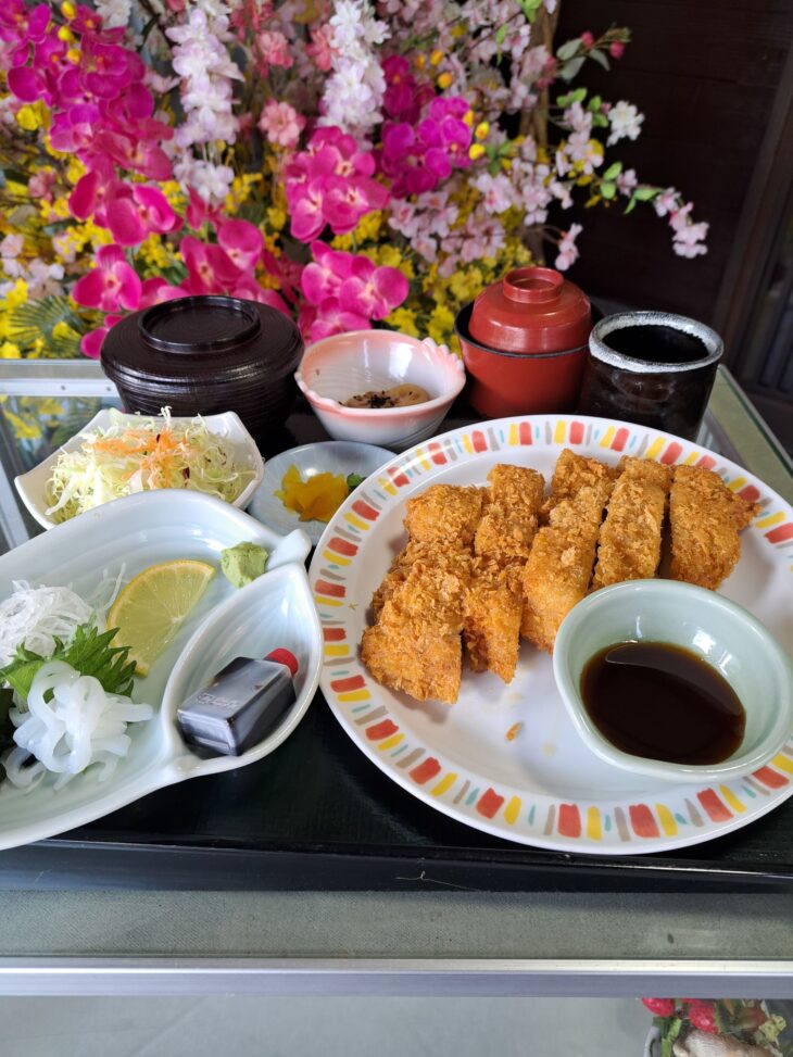 こんにちは。 メイン:BIGチキンカツ お刺身:イカソーメン 本当に大きくて、ボリューム満点です! 是非お立ち寄り下さい。 明日の予定は酢豚です。