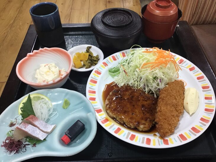 おはようございます 今日のメイン:ハンバーグ 刺身:サーモン 他5品です ご飯のおかわり無料です ご来店お待ちしております -