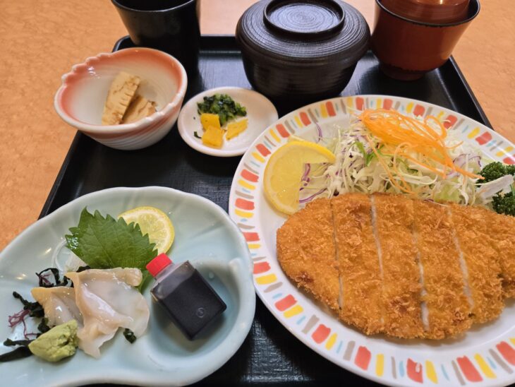 おはようございます 今日のメイン:じゃがいもコロッケと骨なし唐揚げ 刺身:甘エビ 他5品です ご飯のおかわり無料です